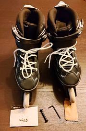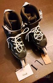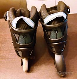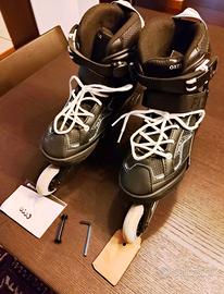 Vendo causa inutilizzo Rollerblade marca Oxelo (Decathlon), taglia 35-38, utilizzati solamente un paio di volte. Presentano solamente qualche graffio. Le ruote sono integre e completamente lisce, poiché utilizzati in pista. Nel pacchetto fornisco anche le istruzioni d'uso, la chiave a brugola e una vite compresa di bullone come ricambio in caso di necessità. Vendo a parte, vedasi annuncio, set di protezioni (ginocchia, gomiti e polsi).
