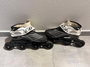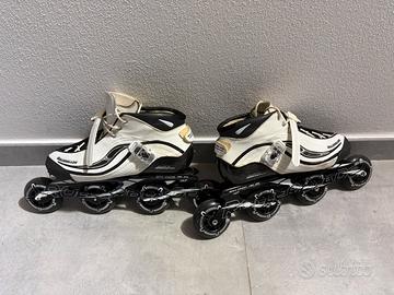 Buone condizioni, usati pochissimo per misura errata. Set ruote extra Oxelo 76mm. Specifiche tecniche: Boot Brand Rollerblade Model Racemachine Platinum Fit 100% carbon Configuration Slot Width Frame Brand Rollerblade Frame Material Aluminum Frame Length 13,3 inch Mount Spacing 195mm Configuration 4×100 mm Wheels & Bearings Wheel Brand MPC Diameter 100 mm Hardness 84a Bearing Brand Powerslide Bearing Brand abec 5, 608zz