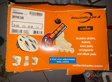 Scarpe da pattinaggio per bambini, taglie riportate: 33-36,5 taglia europea, le altre taglie sono riportate nell’etichetta al di fuori della scatola. Il resto delle cose incluse è andato perso indi per cui posso fornire solo scarpe che sono in ottimissime condizioni, usate max 10 volte ad esagerare causa seguente disinterassamento allo sport.