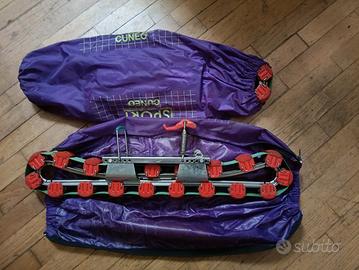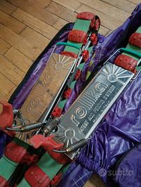 Un paio di sci d'erba vintage, i Rollka realizzati da Erbaski in Italia. Gli sci d'erba sono stati creati originariamente in Germania nel 1963 da Josef Kaiser, pensati per l'allenamento fuori stagione, ma nel tempo si sono evoluti in uno sport a sé stante. Gli sci sono in buone condizioni vintage. I battistrada scorrevoli si muovono bene e l'attacco regolabile.