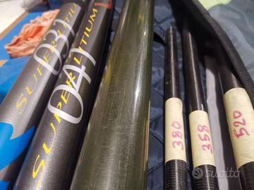 Vendo Roubasienne Maver 031 Superlithium 13 mt, pompa aggiuntiva superlithium 041 per arrivare a 14,5. 3 punte aggiuntive da 5,20 mt, 3,80 mt e 3,50 mt. Porta roubasienne Maver incluso. Non spedisco.