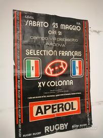 Vendo manifesto originale di 44 anni, XV colonna contro selezione francese sabato 23 maggio 1981.Padova stadio del Plebiscito sponsor dell'epoca APEROL .Partita vinta come si evince dalla ricerca da nostra selezione XV COLONNA e si può vedere anche arbitro, capitano, selezionatori. Pezzo unico misure cm. 100x 70 : Ricordo che XV colonna erano selezionati tra migliori giocatori veneti.