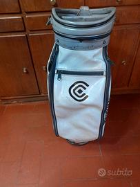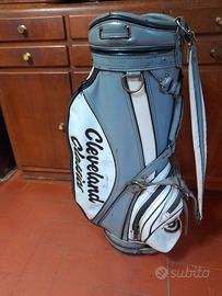 Sacca da golf Cleveland Classics, vintage, in pelle, con segni del tempo e di usura ma comunque in buone condizioni. Altezza 90cm, diametro 26cm.