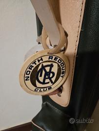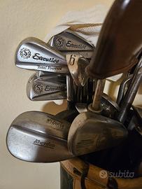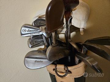sacca da golf vintage in pelle nera con bastoni da golf. La sacca è progettata per trasportare l'attrezzatura necessaria per giocare a golf, inclusi legni, ferri. prezzo interessante, trattabile. I bastoni mostrati includono ferri con la scritta "Executive" e legni con testa in legno, tipici dei set di qualche decennio fa.
