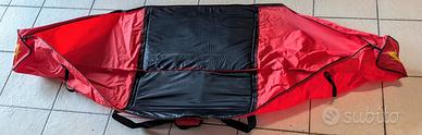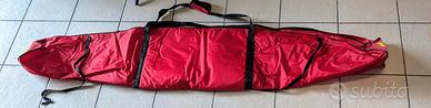 Sacca porta ski e tennis rossa della Volkl usata ma ben tenuta con interno imbottito e resistente, robusta e pratica da riporre.con Due lacci laterali e pratica lampo di chiusura.