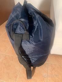 Sacca da viaggio/palestra ellesse Tessuto pesante impermeabile e lavabile, con comparto unico, chiusura con coulisse con cordone, tracolla mono spalla regolabile, con tasca anteriore con chiusura lampo, dimensioni 79x58, colore blu con logo colorato ellesse, mai usata ottimo stato.