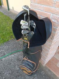 Bella pregiata sacca da golf in pelle, buone condizioni generali come da foto, con 10 mazze varie