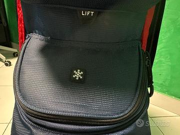 Cinghia di sollevamento della sacca - la tasca frontale superiore si solleva per permettere il passaggio di una cinghia e si ferma con Velcro per rimanere in posizione.