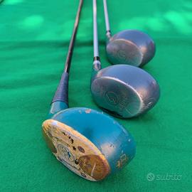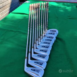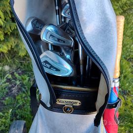 SACCA GOLF SLAZENGER VINTAGE COMPLETA DI: 9 FERRI (3-4-5-6-7-8-9-10-11) 3 LEGNI DI CUI N.1 PGA DA COLLEZIONE + 3-5 ASTRON ROCKER SOLE - MIZUNO + PUTTER + OMBRELLO.