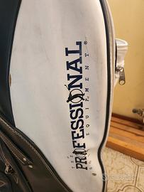 Vendo sacca golf vintage in pelle di The Professional golf Equipment con i difetti mostrati in foto. La sacca è da ripulire con prodotti appositi ma, tolta una cerniera facilmente sostituibile (foto), è ancora perfettamente utilizzabile. É presente il cappuccio per chiuderla interamente nella parte superiore.