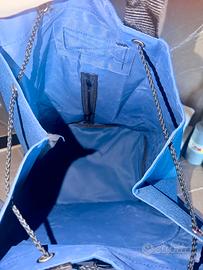 Sacca sportiva nuova, mai utilizzata. Colore blu, lacci e cuciture neri. Scomparto sotto per scarpe. Molto capiente con un reparto frontale. Spallacci regolabili.