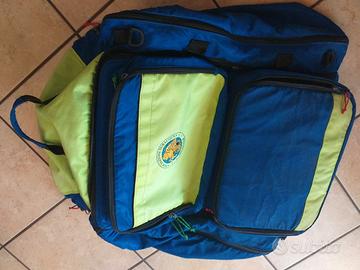 sacca/zaino per muta e accessori subacquei, con tasconi frontali e laterali muniti di cerniere, possibilità di trasformarla in zaino da spalla, molto capiente, può contenere tranquillamente la muta, le pinne, scarpe, guanti ecc ,necessari per un'escursione in mare, colore blu e giallo, con logo dell' "associazione subacquea atlantide".
