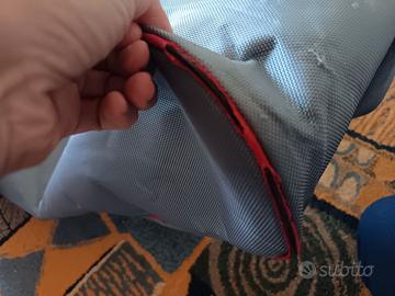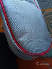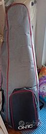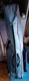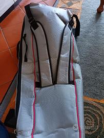Borsa per Scherma 106x35. Senza ruote. Resistente, senza squarci ma con segni di usura, come si può vedere dalle foto. Può contenere tutta l'attrezzatura da scherma. Verrà spedita ripiegata, per contenere le spese di spedizione. Vendo separatamente anche guanto destro e completo casacca e pantalone taglia 46.