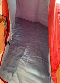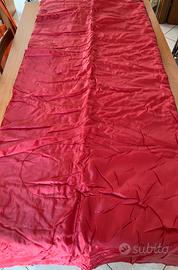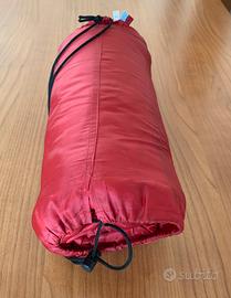 Vendo sacco a pelo colore rosso, completo di sacca custodia. Misura 190 x 75 cm, adatto per campeggio, viaggi, ospiti o utilizzo occasionale. Dalla stampa sulla sacca risultano tessuto esterno in polyester 170T WP WR, interno polycotton/ polyester e imbottitura da 150 gr/m. È un modello leggero, quindi più indicato per stagioni miti o uso estivo che per temperature rigide. Condizioni buone, usato, con normali pieghe da riposizione nella sacca.