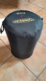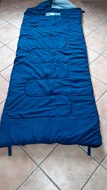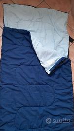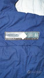 sacco a pelo Ferrino Yuma S invernale, fodera in cotone blu, con attacchi per poterlo appendere, chiusura con zip e velcro, interno in fibra sintetica, usato ma ben conservato e lavato, misure chiuso cm. 80x 235 + copritesta aperto cm. 30.
