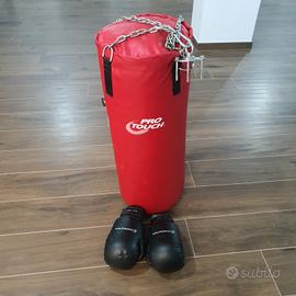 Vendo sacco Boxe pieno seminuovo utilizzato pochissimo dal peso di 30kg alto 80cm made in Italia ,compreso di staffa in acciaio per aggancio a soffitto ,guantoni boxe professionali