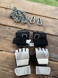 Vendo per inutilizzo : Sacco box marca out shock 14 kg rosso Catena lunghezza 3 mt + 2 moschettoni Due paia di guanti boxer Corda per saltare Estensore body building regolabile Strap training domyos