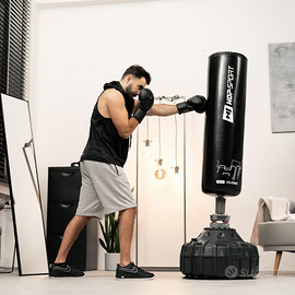 ARTICOLO NUOVO 10 PEZZI DISPONIBILI Il kit include: - sacco autoportante - guantoni boxe 10oz - corda - fasce da boxe 2,5m Sacco da allenamento autoportante HS è un'ottima alternativa al tradizionale sacco da boxe, che non richiede montaggio al soffitto. È uno strumento che può essere utilizzato non solo per perfezionare le tecniche di arti marziali, ma anche come forma di allenamento di potenziamento, mirato a costruire forza e scolpire i muscoli . Il sacco da allenamento con un'altezza di 180 cm e un diametro di 32 cm, è caratterizzato da un sistema anti-shock innovativo , basato su 4 molle con ammortizzatori, che elimina le vibrazioni e le oscillazioni che si verificano durante l'allenamento. Base stabile , dotata di 25 ventose , previene lo spostamento del sacco e garantisce un allenamento sicuro nel comfort della propria casa Allenamento efficace e sicuro Sacco autoportante HS con dimensioni 180 x 32 cm rappresenta un'ottima proposta sia per gli allenamenti di arti marziali, sia come strumento per esercizi di potenziamento , volti a sviluppare forza e scolpire i muscoli. Grazie alle innovazioni applicate, come il sistema anti-shock , il supporto su basi a molla e la tecnologia di rotazione a 360 gradi , garantisce un allenamento efficace e sicuro , eliminando completamente la necessità di montaggio al soffitto, necessario per i tradizionali sacchi da boxe. Sistema di assorbimento degli urti Il sacco da allenamento autoportante è dotato di una tecnologia anti-shock innovativa , che elimina efficacemente le vibrazioni e le oscillazioni che si verificano durante l'esecuzione dei colpi. Funziona secondo il principio di un sistema a quattro molle posizionate alla base del sacco, con ammortizzatori aggiuntivi su entrambi i lati. Al momento del colpo, le molle reagiscono, ritirandosi all'indietro, e gli ammortizzatori assorbono efficacemente tutte le vibrazioni . Questo meccanismo permette all'utente di percepire vibrazioni minime.