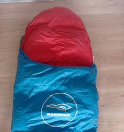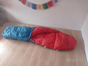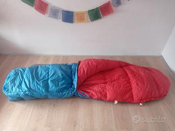Sacco piuma in vera piuma d'oca, interno in cotone, esterno in micropore traspirante, adatto a spedizioni alpinistiche in alta quota, lungo m 1,90 peso kg 2,20. Usato due volte in Himalaya.