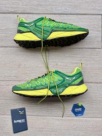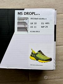 Realizzata nello specifico per la mobilità dinamica su terreni difficili, la Dropline ha una costruzione leggera in rete e un’ammortizzazione ottimale degli impatti, per poter svolgere attività fisica più a lungo. Grazie all’uso di diversi avanzati materiali sintetici sulla tomaia, abbiamo potuto rendere ancora più consistente l’intersuola, in modo da assicurare un comfort più morbido in fase d’appoggio. La suola in Pomoca arrotondata vanta ottime prestazioni, oltre che un’ottima trazione su tutti i tipi di terreno, mentre il design S-Path favorisce il movimento naturale di stacco e una transizione più naturale dal tallone alla punta. L’intersuola in EVA ad alte prestazioni garantisce ammortizzazione leggera e comfort, minimizzando la forza d’impatto su articolazioni e muscoli. La nostra tecnologia interna brevettata per le calzature offre una protezione eccellente e completa su svariati terreni alpini. Il sistema Salewa 3F, l’avvolgente EXA Shell e la conchiglia del tallone che previene le oscillazioni bloccano il piede sostenendolo, e assicurano la stabilità torsionale. All’interno, la soletta traspirante in Ortholite garantisce un’ammortizzazione superiore, allontanando l’umidità e contribuendo a mantenere il piede più fresco e asciutto. Da una tradizione di massimo comfort, ispirata agli escursionisti che procedono in velocità, Dropline è la scarpa ideale per salire e scendere in sicurezza durante lo speed hiking in tutte le condizioni atmosferiche. Lacci: Flat Shoelace Peso singola scarpa: 350 g Segmento suola: Speed Hiking