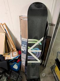 Snowboard Salomon con sacca Decathlon. Attacchi non inclusi. Lo snowboard è stato acquistato 3 anni fa e l'ho usato pochissimo. Ha ancora parecchia lamina sul rail e l'unico danno è superficiale nella parte superiore del rail. La lunghezza è di 159 cm. Gli scarponi Burton sono disponibili anche nella taglia 45. Controlla il mio altro annuncio e posso farti uno sconto se sono inclusi.
