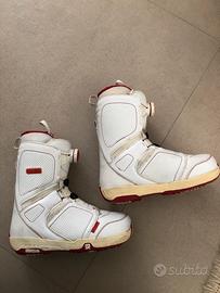 Scarponi per snowboard da donna/ragazza marca salomon modello Pearl Boa numero 38. Presi due anni fa ma gia’ usati a loro volta, visto il costo da nuovi e considerando che la moglie poi (probabilmente) avrebbe mollato si sono rivelati un buon investimento anche per la qualita’ . Ottimi per chi vuol iniziare senza investirci troppo e non avendo la certezza di sapere se poi non piace sciare. Dalle foto si vedono i segni d’uso. Il numero dello scarpone e’ 38 ma la moglie ha il 37, solitamente si usa un numero in piu’ ma l’ideale sarebbe provarlo. Regalo il borsone porta scarponi della maxi sport