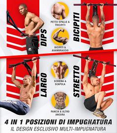 Sbarra per trazioni e dip, portatile, modello PullUp&Dip, praticamente nuova, completa di borsa e accessori per fissaggio e trasporto. Vendo a 150 euro.