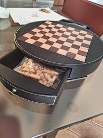 Scacchiera nuova ancora in confezione originale. prezzo originale 85€. materiale legno ed ecopelle, pezzi di scacchi e dama realizzati in legno, 2 cassetti.