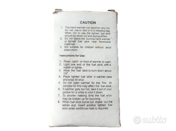 Vendo scaldamani con 12 bastoncini di combustibile. Mai usato. Copertura in velluto. Ottimo per campeggio, scoutismo, attività all'aperto... Con 12 bastoncini di combustibile.