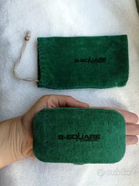 B-Square Outdoor, tessuto esterno vellutato verde muschio. Lungo 11,5 cm, largo 7 cm, profondo 1,5 cm. Si apre lo scaldino, si accende lo stick e lo si posiziona dentro allo scaldino, poi si chiude a pressione la scatola e si gode uno strepitoso calore alle mani. Scaldino completo di uno stick a carbone e sacchetto di tessuto vellutato verde muschio originale. Usato poche volte, presenta qualche piccolo graffio sul metallo interno.