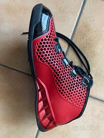 Vendo paio di scarpe sportive rosse e nere da ragazzo/uomo, adatte per giocare a basket sul campo da basket di legno (parquet).