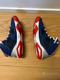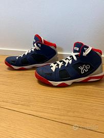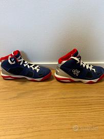 Scarpe da pallacanestro, blu, rosso, argento, Kipsta tg 37. Una estremità di un laccio è un po’ usurata, come mostrato in foto, per il resto le scarpe, utilizzate esclusivamente in palestra, sono in ottime condizioni.