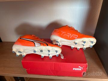 Vendo scarpe da calcio per bambino Puma Ultra Play FG/AG Jr, colore arancione con dettagli bianchi e blu, taglia 29 EU.