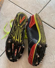 Scarpe chiodate atletica leggera, scatola originale, chiodi da 9 mm (nella confezione) e chiodi da pista (montati).Due chiavi per montare chiodi.
