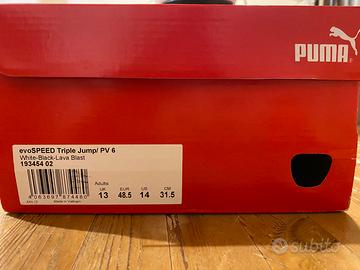Scarpe chiodate per salto triplo, Puma EvoSpeed, colore White-Black-Lava Blast, numero 48.5 europeo. Usate una volta. Complete di scatola, sacca porta scarpe, chiave per chiodi in dotazione. Vendo per inadeguatezza della calzata.