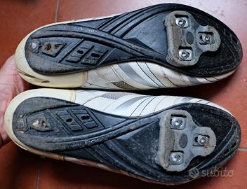 Molto usate, qua e là spellate, ma ancora utilizzabili. Lo classifico come "danneggiato" ma le ho solo "messe da parte", le usavo ancora. Tacchette per pedali Look.
