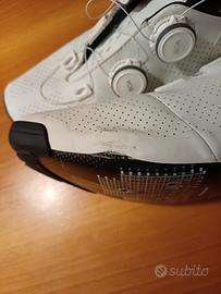 Scarpe misura errata. Usate quattro volte. Sono un 45 ma vanno bene per un piede 44 ( non più di 27, 5 cm). Ho tentato di allargarle con il calore, visto che erano dichiarate termoformabili, perché la zona del metatarso, nonostante fossero misura large, era stretta. In una foto si vede che la tomaia sulla parte interna della scarpa destra all' altezza dell'alluce si è deformata. A causa del maltrattamento subito le propongo a 100 euro contro i 200 di listino.