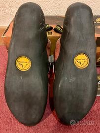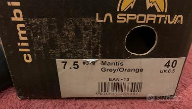 Scarpe da arrampicata La Sportiva modello Mantis. Versione con allacciatura con tre velcri. La tomaia è realizzata con costruzione tubolare. Plantare con tecnologia P3 che assicura il sostegno della forma evitando