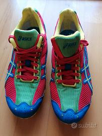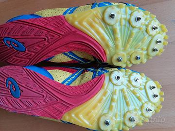 Vendesi scarpe da atletica Asics taglia 39.5, con chiodatura standard da 6 mm.