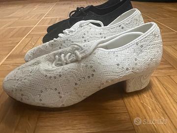 Entrambe numero 37, in pizzo con paiettes, un paio bianco, l’altro nero.