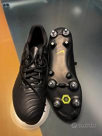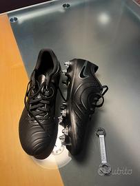 Queste scarpe da calcio Nike Tiempo Legend sono completamente nere, con tomaia in pelle premium morbida e texture rigata per un controllo palla eccezionale e comfort ottimale. La suola FG presenta tacchetti esagonali intercambiabili in metallo per aderenza su erba naturale umida o campi morbidi, con design conico per cambi di direzione rapidi.
