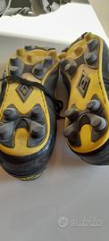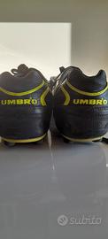Scarpe da calcio Umbro in pelle nera e rifiniture giallo acido ,n.45 in buono stato e parastinchi Adidas