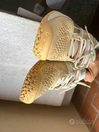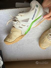 Vendo scarpe da tennis della marca Babolat, modello dedicato a Wimbledon, perfette per chi cerca stabilità e prestazioni sul campo. Come si vede dalle foto, sono state usate, ma la suola Michelin è ancora in buone condizioni e la struttura della scarpa è intatta.