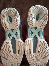Usate pochissimo, lavate e profumate, adatte al Padel e al tennis misura 36 e 1/2 ma adatte a chi porta 36 scarpe normali. Colore rosa/arancio fluo