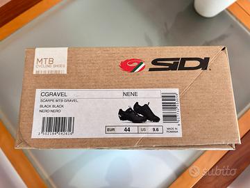 Scarpe Gravel/MTB Marca SIDI colore nero in ottime condizioni misura 44 EUR - US 9,6 con tacchette Shimano sgancio rapido SM-SH51. La scarpa destra presenta una leggera usura sulla parte interna del tacco ma per il resto sono perfette.