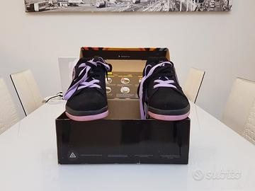 Vendo scarpe con pattini installabili e sfilabili nel tallone pari al nuovo usate una sola volta, taglia 39. Colore nero e viola, perfette.