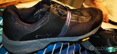 Scarpe Northwave Crossland Plus Woman mtb flat num. 38 pari al nuovo, pari al nuovo. Colore nero con Striscia laterale cangiante dal viola al turchese. Chiusura rapida millimetrica con sistema boa. Scarpa morbida e molto comoda adatta a mtb, ebike, mountain bike.