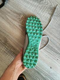 Scarpe da calcetto/sportive marca Puma con tomaia a nido d'ape grigio/bianco e logo nero. Suola in gomma verde con tacchetti bassi ideali per terreni sintetici o superfici dure. La lunghezza della suola è di circa 27-28 cm Prezzo trattabile