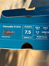 scarpe da trail running Brooks Cascadia 17 GTX da donna. Taglia 7,5 (n. 38.5) I materiali impermeabili offrono protezione extra in condizioni di umidità o di bagnato, mentre la morbida ammortizzazione e la stabilità migliorata assicurano giornate di comfort su ogni tipo di terreno.