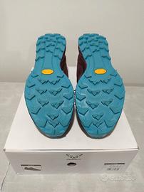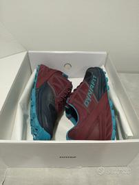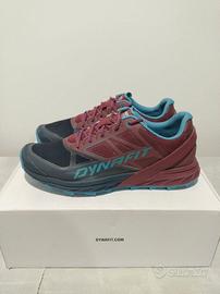 Scarpe da trail running trail running all-terrain Dynafit Alpine. - Tomaia in mesh traspirante. - Suola Vibram Megagrip con tassellatura pronunciata per un grip ottimale. - Colore blu scuro e granata. - Numero 42,5 - Intersuola Alpine Rocker - Linguetta elastica - Goccia: 6 mm - Peso: 260 g Condizioni: Ottime - Usate per un paio di uscite.
